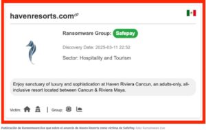 Ambos sitios reportaron que Haven Resorts fue listada como víctima de SafePay en un foro de filtraciones, indicando que la empresa no habría pagado el rescate exigido por los atacantes.