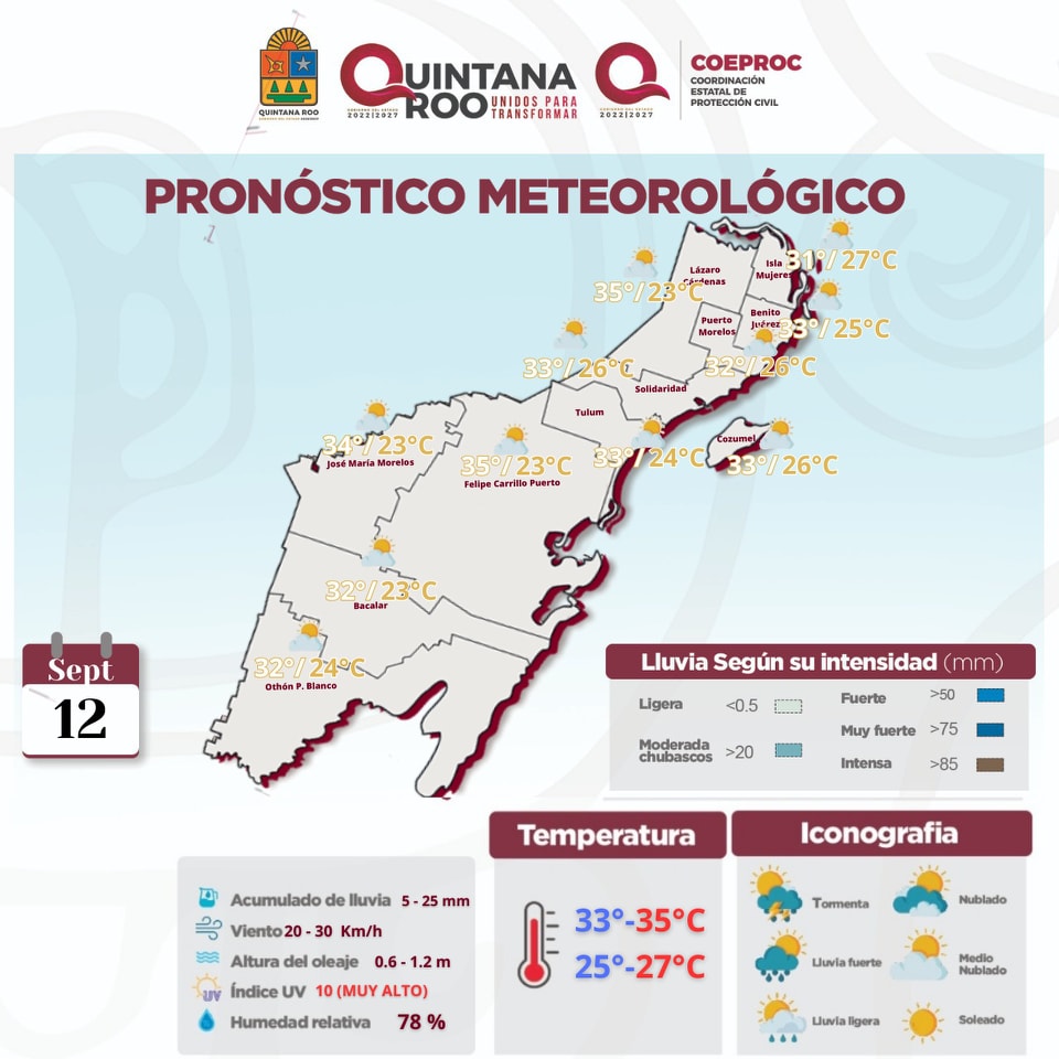El fenómeno originará cielo medio nublado con incremento de nublados durante el transcurso del día, lluvias con intervalos de chubascos acompañadas de actividad eléctrica sobre la mayor parte del Estado de Quintana Roo.