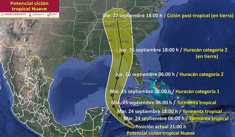 El potencial ciclón tropical Nueve continúa desplazándose sobre el noroeste del Mar Caribe, aproximándose a costas de Quintana Roo. Su circulación producirá lluvias muy fuertes a intensas, además de fuertes rachas de viento en zonas de la Península de Yucatán.