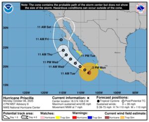 Los Cabos, Baja California Sur. (Marcrix Noticias). — El huracán Priscilla obligó este lunes al cierre de los puertos en Cabo San Lucas y otras zonas marítimas de Baja California Sur, como medida preventiva ante las condiciones adversas que provoca su paso por el Pacífico. Autoridades marítimas, en coordinación con Protección Civil, emitieron alertas y recomendaciones para evitar accidentes en alta mar y proteger a los habitantes de zonas vulnerables.