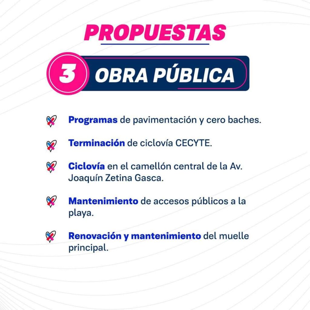 En obra pública, se pondrá en marcha un programa de pavimentación y cero baches, construcción de ciclovías: en la cabecera municipal en el camellón central de la avenida Joaquín Zetina Gasca y, en Leona Vicario, la conclusión de la ubicada en carretera Costera a la altura del CECyTE, asi como el mantenimiento de alumbrado público.