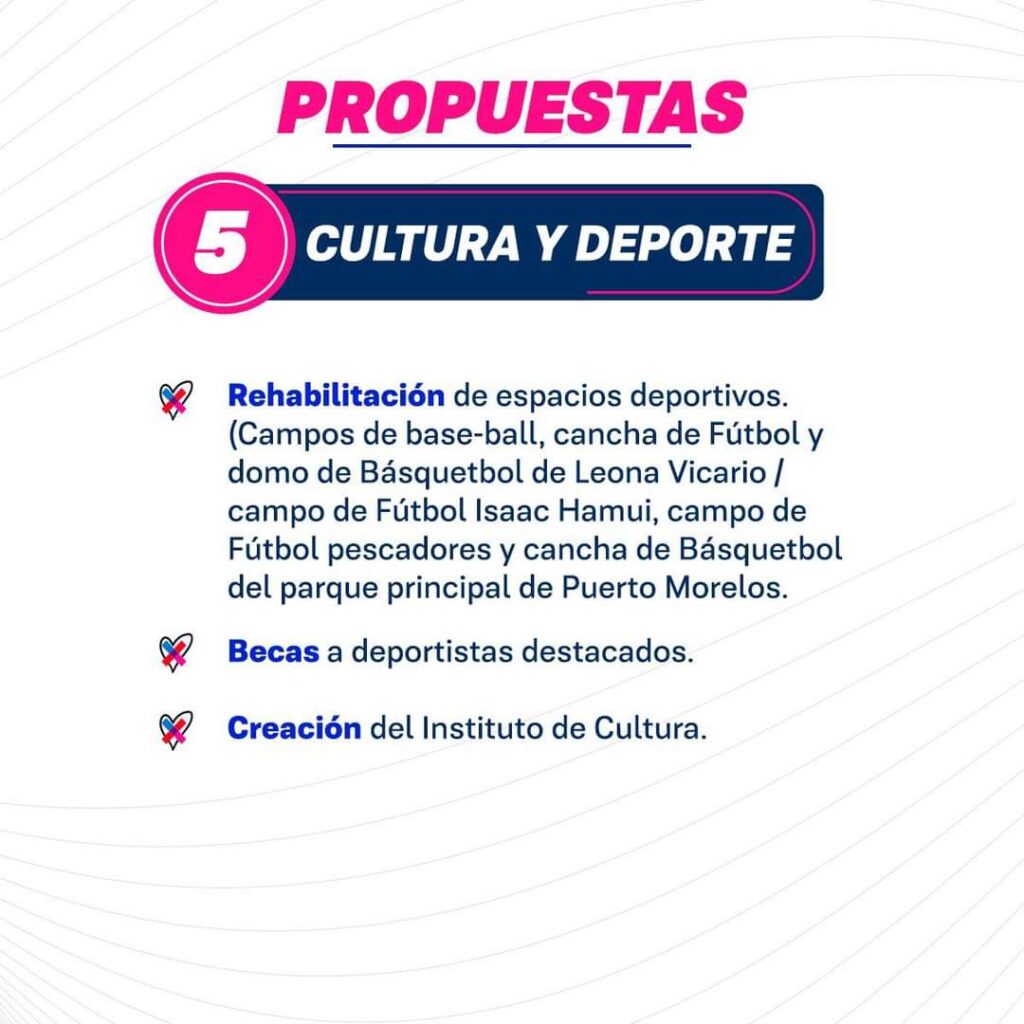Para fomentar la cultura y el deporte, se propone la rehabilitación de espacios deportivos y la creación del Instituto de Cultura, así como el apoyo a deportistas destacados mediante becas.