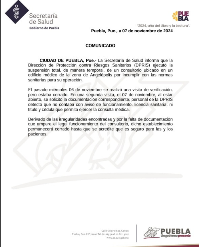 Este jueves, la Secretaría de Salud del Estado de Puebla llevó a cabo la clausura de su consultorio ubicado en las Torres Médicas II, en la zona de Angelópolis, tras recibir diversas denuncias sobre las irregularidades en su práctica profesional.