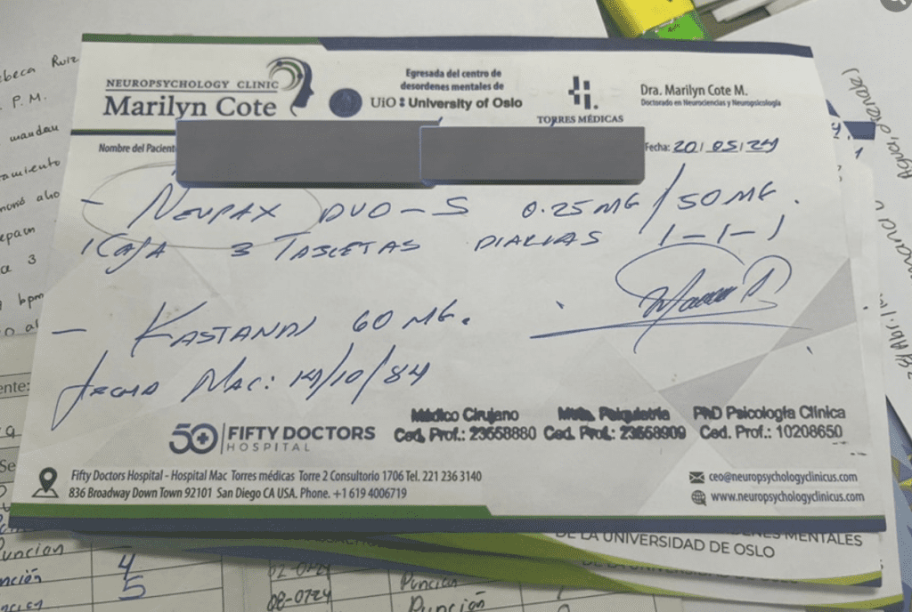 Uno de los puntos más graves del caso es que Cote, emite recetas de medicamentos controlados, como Duloxetina y Quetiapina, fármacos cuya venta está restringida a profesionales de la psiquiatría.