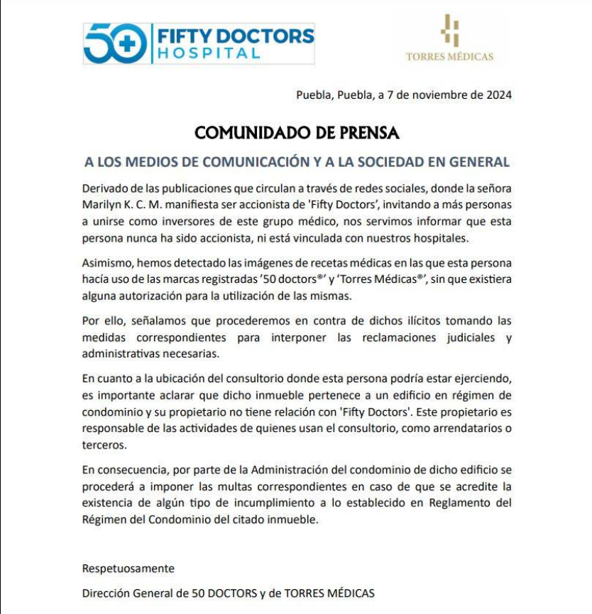 Ambos, tanto Torres Médicas como Fifty Doctors, emitieron comunicados aclarando que no tenían ningún vínculo con la falsa psiquiatra, y anunciaron su intención de tomar acciones legales en su contra.