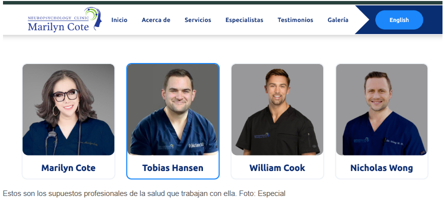 Además de los testimonios de pacientes insatisfechos, se encontraron diversas alteraciones fotográficas en sus perfiles profesionales, en los que aparecía junto a logos de instituciones prestigiosas o utilizando imágenes manipuladas de personas que supuestamente trabajaban en su equipo médico, las cuales resultaron ser modelos de internet.