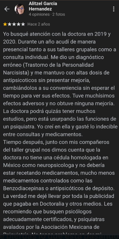 Además de promocionar sus servicios de salud mental en su página web, donde decía tener estudios en neuropsiquiatría y neuropsicología.