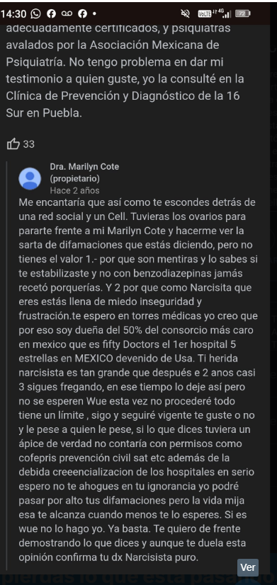 Marilyn Cote se defendió públicamente de las acusaciones en su contra, afirmando que cuenta con todos los títulos necesarios para ejercer la profesión, aunque aclaró que estos no están registrados en el Registro Nacional de Profesionistas debido a su estatus de “extranjera”.