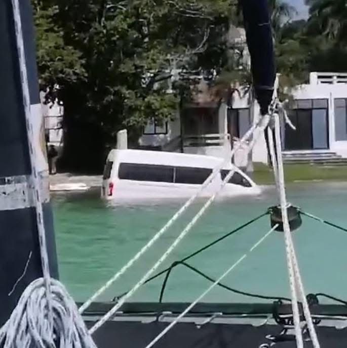 Mediante videos que ya circulan en redes sociales se observa una camioneta tipo van que cayó a la Laguna de Bacalar.