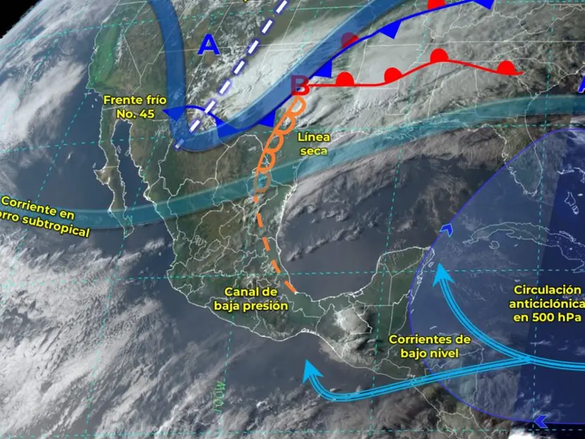 El frente frío 45 se desplazará sobre la vertiente del Golfo de México y sureste mexicano, en interacción con una vaguada prefrontal, ocasionará chubascos y lluvias fuertes acompañadas de descargas eléctricas y posible caída de granizo en el oriente y sureste del territorio nacional.