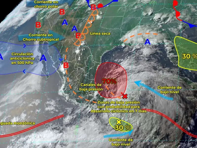 Continuará el temporal de lluvias en el sureste y oriente de México, así como en la Península de Yucatán, favorecido por las zonas de baja presión con potencial ciclónico la primera sobre el suroeste del Golfo de México y la segunda al sureste de las costas de Chiapas, aunado a la entrada de humedad generada por la vaguada monzónica, ocasionarán lluvias fuertes a puntuales intensas.