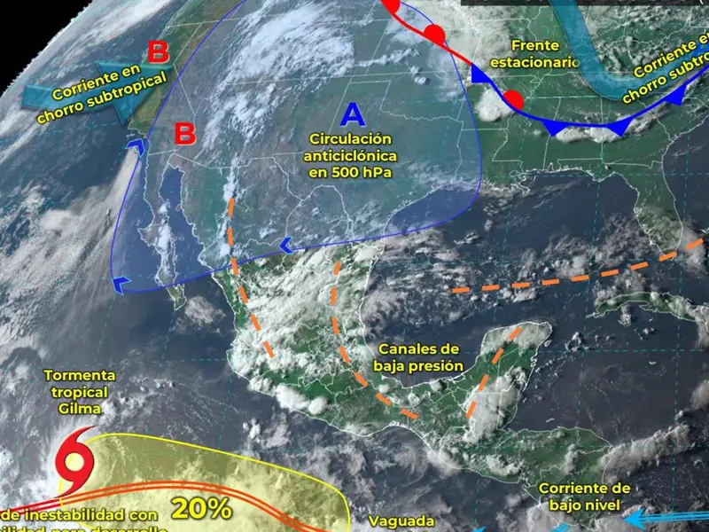 El monzón mexicano en interacción con inestabilidad en niveles altos de la atmósfera y con un centro de baja presión en altura que se establecerá sobre el noroeste del país, generarán lluvias muy fuertes a puntuales intensas en dicha región, así como chubascos y lluvias fuertes en la península de Baja California.