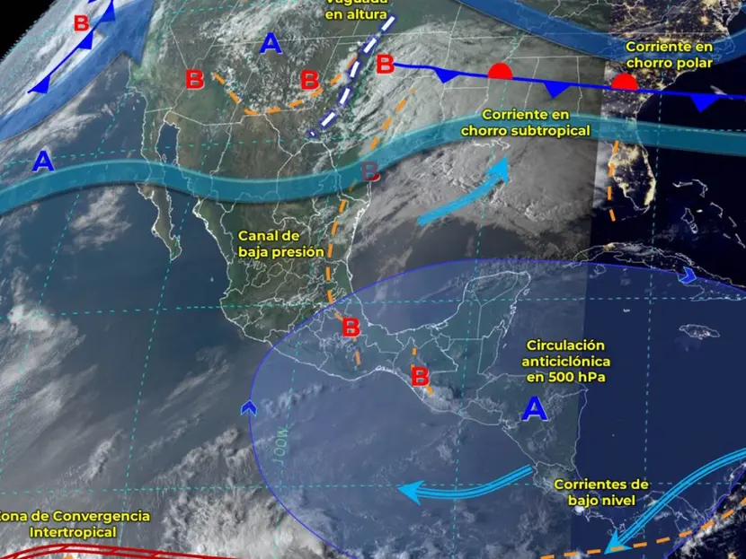 El frente frío 41 se desplazará sobre el noreste y oriente del país e interaccionará con canales de baja presión que se extenderán sobre el suroeste del Golfo de México y la Península de Yucatán; dichos sistemas producirán lluvias con intervalos de chubascos.