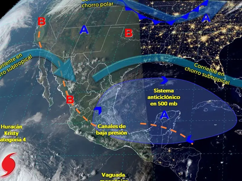 Canales de baja presión sobre el noroeste, occidente, oriente, sur y sureste mexicano, además de la península de Yucatán, en interacción con el ingreso de humedad del Océano Pacífico, Golfo de México y mar Caribe, e inestabilidad en niveles altos de la atmósfera, ocasionarán lluvias y chubascos en las regiones mencionadas, siendo lluvias puntuales fuertes en Veracruz, Chiapas, Tabasco y Quintana Roo.