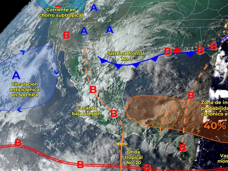 Por su parte, la onda tropical 20 se desplazará sobre el occidente de la República Mexicana, se combinará con inestabilidad en niveles altos de la atmósfera, propiciando lluvias muy fuertes a puntuales intensas con descargas eléctricas, rachas de viento y posibles granizadas. A su vez, un canal de baja presión extendido sobre el interior del territorio nacional, aunado al ingreso de humedad del océano Pacífico y Golfo de México, generarán lluvias fuertes a muy fuertes, descargas eléctricas, rachas de viento y posible caída de granizo en el oriente, centro y sur del país, incluido el Valle de México.