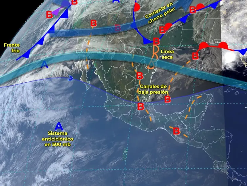 Por su parte, un segundo canal de baja presión se extenderá sobre el sureste del territorio nacional, en combinación con el ingreso de humedad del Golfo de México y Mar Caribe ocasionará lluvias y chubascos en dichas regiones, así como en la Península de Yucatán.