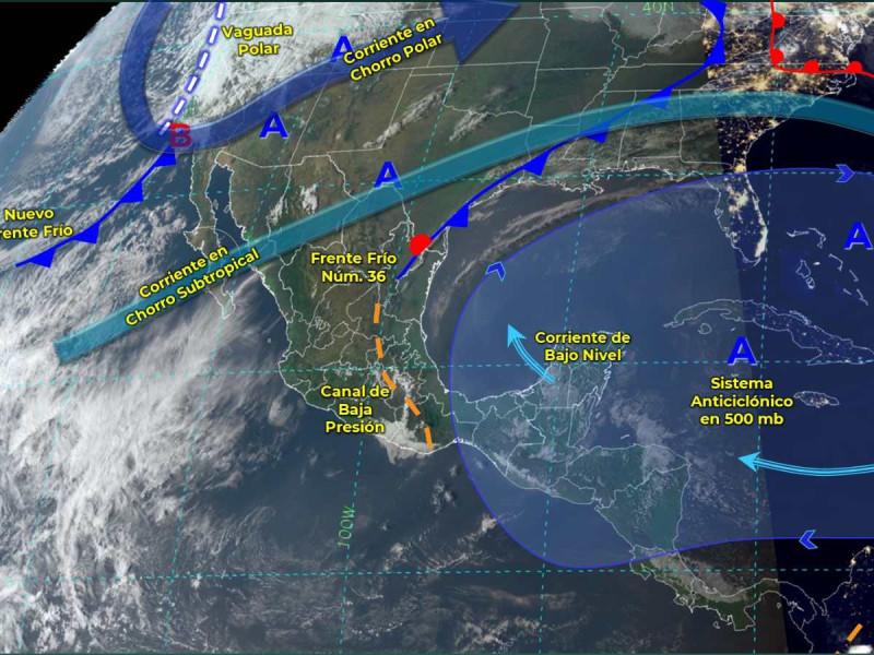 El frente frío 36 inicia el proceso de disipación sobre el noreste del país, en interacción con la corriente en chorro subtropical y un canal de baja presión sobre el oriente de México, originarán la probabilidad de lluvias aisladas en Nuevo León y Tamaulipas