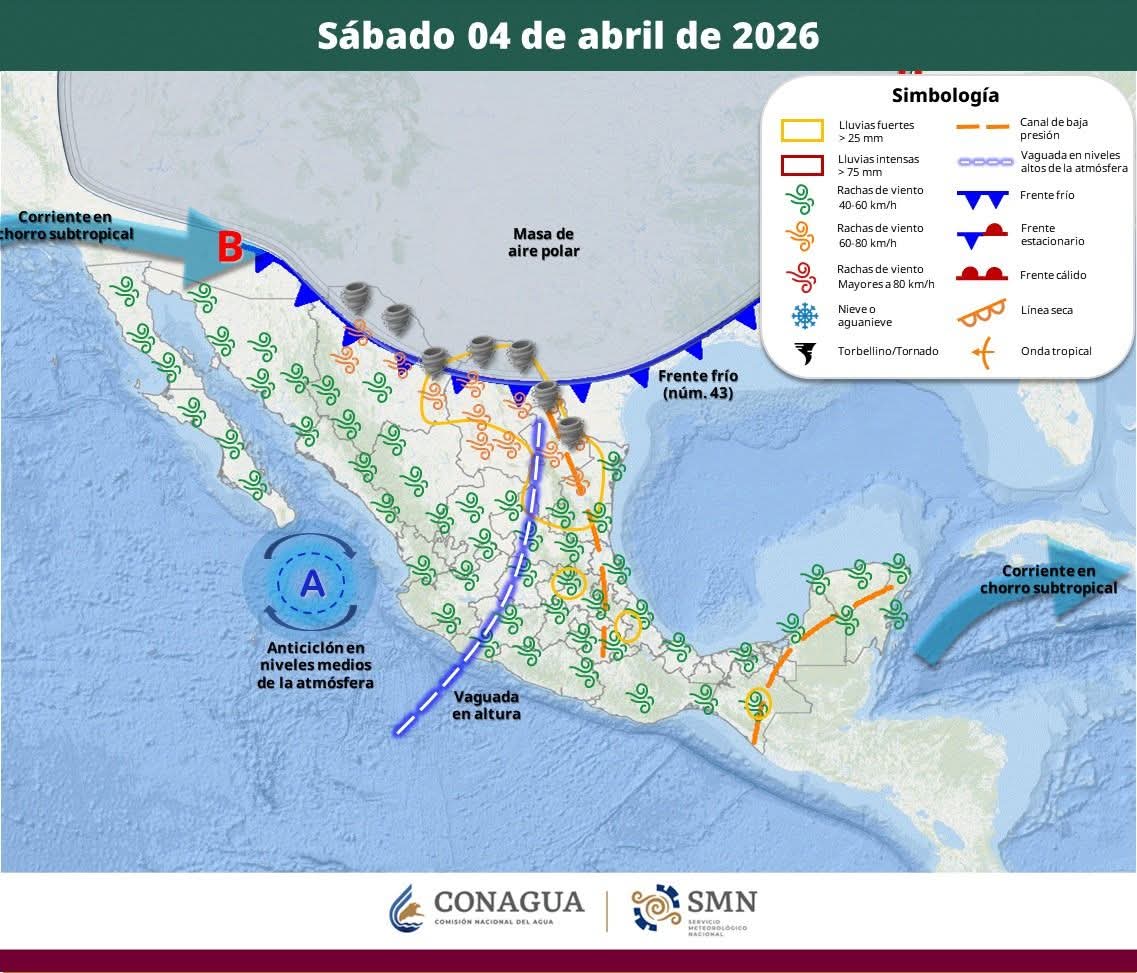 A nivel nacional, el frente frío número 43 y su masa de aire polar se desplazan sobre el norte y noreste del país, interactuando con otros sistemas atmosféricos, lo que provocará lluvias fuertes e incluso caída de granizo en esas regiones.