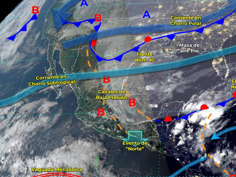 El nuevo Frente Frío número 10 interacciona con las corrientes en chorro subtropical y polar, ocasionando vientos fuertes y tolvaneras en Chihuahua, Durango y Coahuila, además de reforzar el potencial de lluvias fuertes en Nuevo León y Tamaulipas.