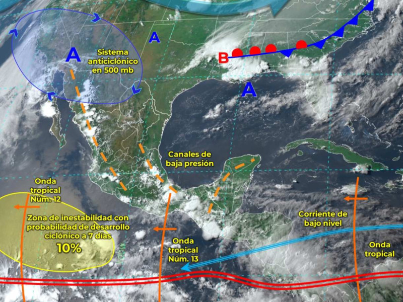 A su vez, el monzón mexicano mantendrá las condiciones para chubascos y lluvias fuertes en la Península de Baja California, Sonora, Chihuahua, Durango y Sinaloa.