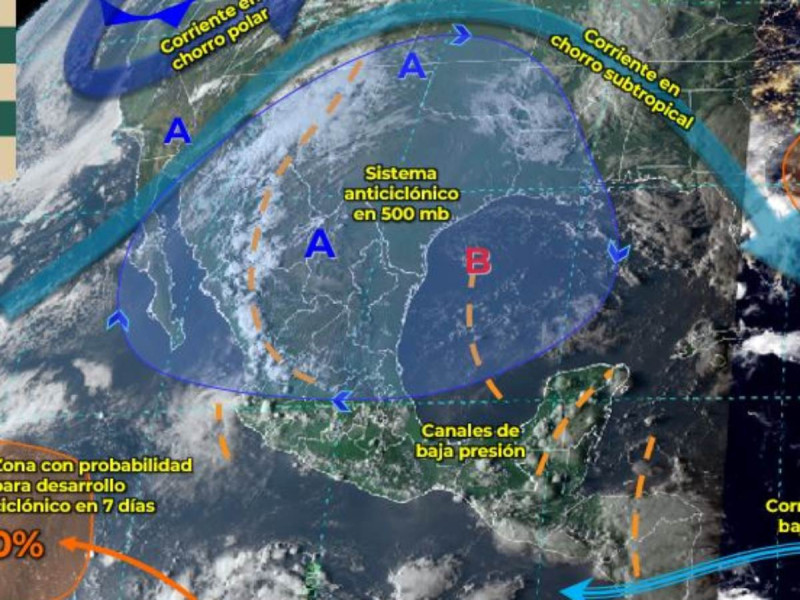 Canales de baja presión prevalecerán sobre el interior del país, el sureste mexicano y la Península de Yucatán, aunados al ingreso de humedad del Océano Pacífico, Golfo de México y Mar Caribe, originarán lluvias puntuales fuertes sobre el occidente y sureste mexicano.