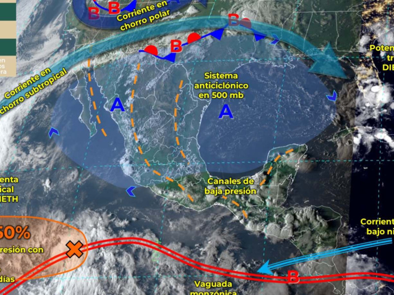 Una circulación anticiclónica en niveles medios de la atmósfera propiciará ambiente vespertino cálido a caluroso en la mayor parte del país, con temperaturas máximas por arriba de los 35 °C en 21 entidades, pudiendo superar los 40 °C en zonas de Sonora y Sinaloa.