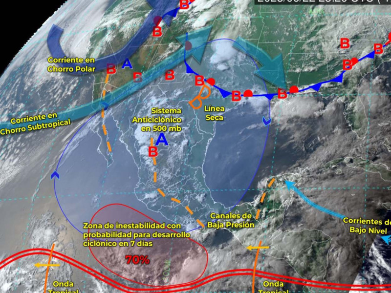 Por otro lado, una línea seca y un canal de baja presión se extenderán sobre la Mesa del Norte, mientras que la corriente en chorro subtropical atravesará el noroeste mexicano, propiciarán chubascos y lluvias puntuales fuertes acompañadas de descargas eléctricas y posible caída de granizo en Chihuahua, Coahuila, Sinaloa y Durango.