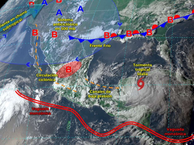 El ciclón tropical “Idalia” se localizará al noreste de la Península de Yucatán, sus bandas nubosas continuarán generando lluvias en zonas de Quintana Roo, Yucatán y Campeche, así como fuertes rachas de viento y oleaje elevado.