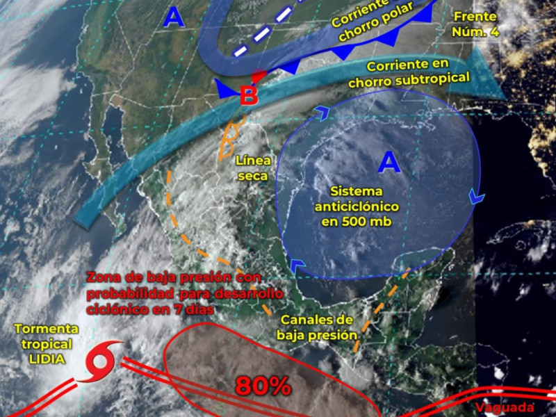 De acuerdo con el comunicado del organismo dependiente de la Comisión Nacional del Agua (Conagua), el ciclón tropical “Lidia” se desplazará al sur de las costas de Baja California Sur, sus desprendimientos nubosos reforzarán el potencial de lluvias sobre el occidente del territorio nacional.