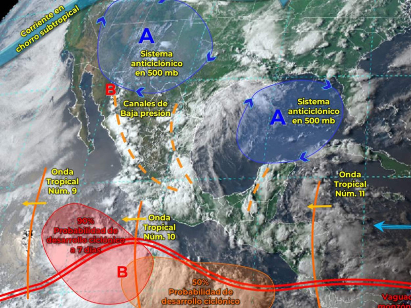 Un posible ciclón tropical al suroeste de las costas de Colima y Jalisco incrementará el potencial de precipitaciones en el occidente del país, así como fuertes rachas de viento y oleaje elevado.