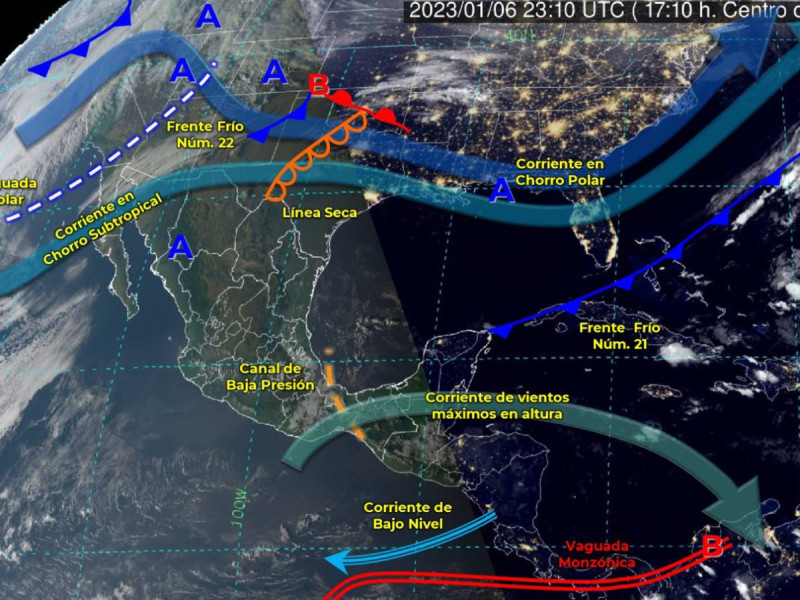 El pronóstico del Clima México para el fin de semana se prevé que el sábado 07 de enero de 2023 el frente frío 22 se extienda sobre el norte del país, mientras que la vaguada polar, la corriente de chorro polar y un canal de baja presión generen vientos fuertes con rachas de 40 a 60 km/h en el noroeste y norte, así como lluvias aisladas en Chihuahua, Coahuila, Nuevo León, Tamaulipas y San Luis Potosí.