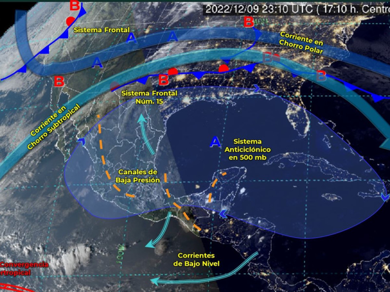 El clima México hoy 10 de diciembre de 2022 prevé lluvias y chubascos acompañados de descargas eléctricas en Veracruz, Oaxaca, Chiapas, Tabasco, Campeche y Quintana Roo, así como lluvias aisladas en Jalisco, Colima, Michoacán, Guerrero y Yucatán debido a la interacción de dos canales de baja presión sobre el occidente y sureste de México.