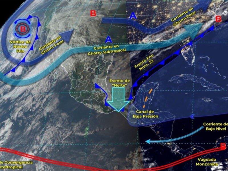 El pronóstico prevé que la masa de aire frío asociada al frente, continuará ocasionando evento de “Norte” muy fuerte en el Istmo y Golfo de Tehuantepec; moderado a fuerte en el litoral del Golfo de México y la Península de Yucatán, además de bancos de niebla en la Sierra Madre Oriental.