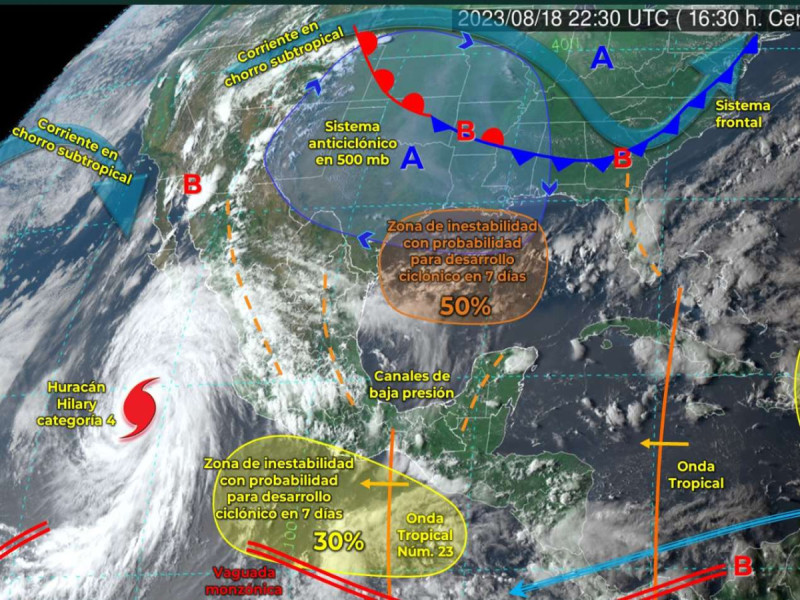 El pronóstico del clima México hoy 19 de agosto de 2023 prevé que la amplia circulación del huracán Hilary junto a los efectos del monzón mexicano provocará lluvias muy fuertes a intensas en el noroeste y occidente de la república mexicana, además de la Península de Baja California, además de rachas intensas de viento y oleaje elevado en Sonora, Sinaloa, Nayarit y Jalisco.
