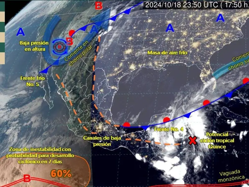 El Servicio Meteorológico Nacional (SMN) dio a conocer el pronóstico del clima México hoy 19 de octubre de 2024, en el que se prevé un temporal de lluvias muy fuertes por el frente frío 4 y el ciclón tropical Quince, que se convertirá en la tormenta tropical ‘Nadine’ en el transcurso del día.