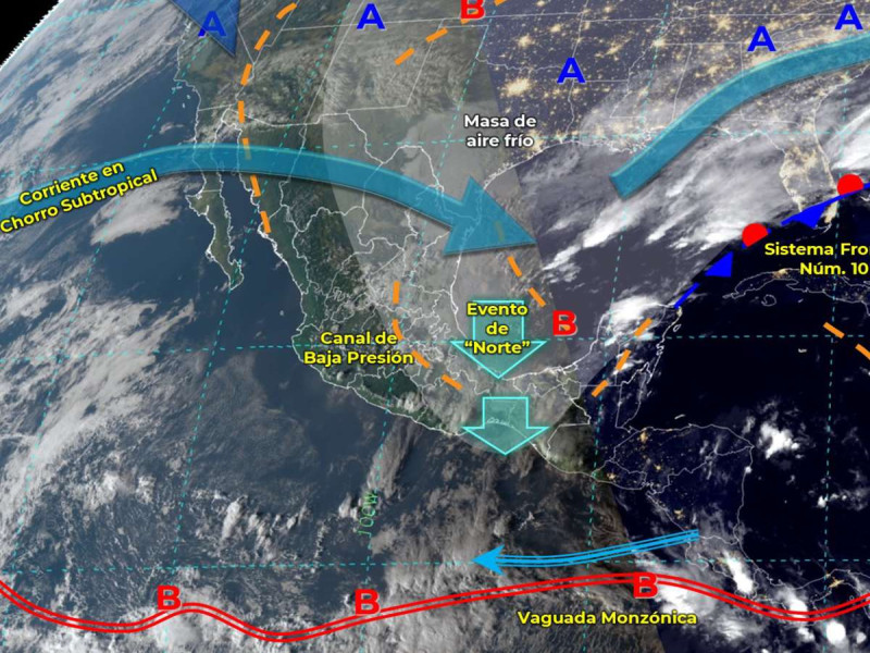 Asimismo, la masa de aire frío que impulsó al frente número 10 comenzará a modificar sus características térmicas, favoreciendo un ascenso de las temperaturas máximas sobre entidades del norte, noreste, oriente y centro de la República Mexicana, así como la disminución en la intensidad del viento del Norte sobre el litoral del Golfo de México e Istmo y Golfo de Tehuantepec.