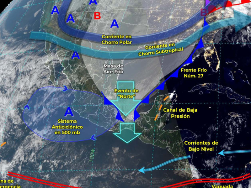 La masa de aire frío asociada al frente frío 27 mantendrá evento de “Norte” fuerte a muy fuerte en el sur del litoral del Golfo de México, la Península de Yucatán, Istmo y Golfo de Tehuantepec, así como bancos de niebla, lluvias y chubascos sobre la Sierra Madre Oriental. A su vez, prevalecerá ambiente frío a muy frío sobre entidades del noroeste, norte, noreste, centro y oriente del territorio nacional, así como gélido en sierras de Sonora, Chihuahua, Durango y Coahuila.