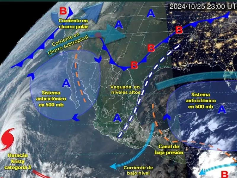 El SMN indicó que para este sábado 26 de octubre de 2024 un canal de baja presión sobre el oriente y sureste mexicano, en interacción con una vaguada en niveles altos de la atmósfera y con inestabilidad en niveles altos de la atmósfera, provocará lluvias intensas en Chiapas, Tabasco, Campeche y Quintana Roo, lluvias muy fuertes en Oaxaca, Veracruz y Yucatán; así como chubascos y lluvias fuertes en el noreste y oriente del país.