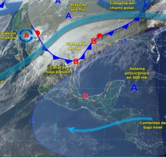 El pronóstico del clima prevé que la masa de aire frío del frente frío 38 mantenga ambiente frío a muy frío sobre el noroeste, norte y noreste de la República Mexicana, así como refrescamiento de las temperaturas en el oriente del país.