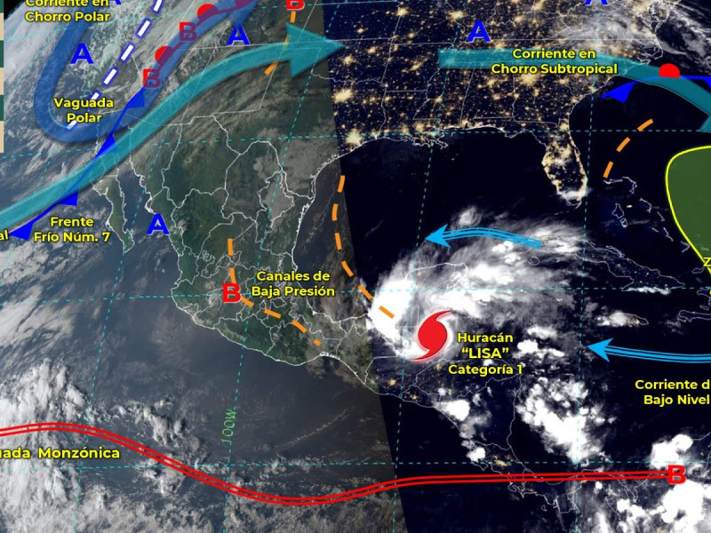 “Lisa” ingresará al país, entre Tabasco y Campeche, ocasionando lluvias muy fuertes a intensas en el sureste mexicano y la Península de Yucatán, con lluvias puntuales torrenciales en Tabasco y Chiapas.