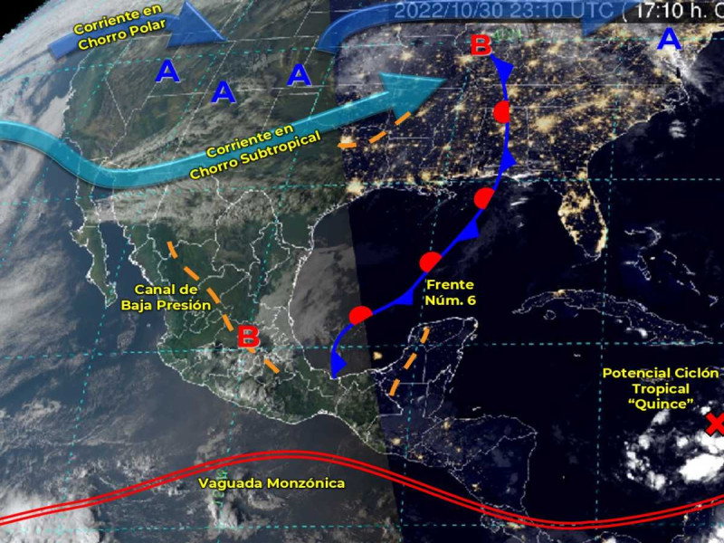 El Frente Frío 6 adquirirá características cálidas en el oeste del Golfo de México y reforzará la entrada de humedad hacia el noreste de México, la cual interaccionará con un vórtice en niveles altos de la atmósfera y una vaguada polar, originando lluvias fuertes a muy fuertes acompañadas de descargas eléctricas, caída de granizo, rachas de viento de 50 a 70 km/h y posible formación de torbellinos y tornados en zonas de Coahuila, Nuevo León y Tamaulipas.