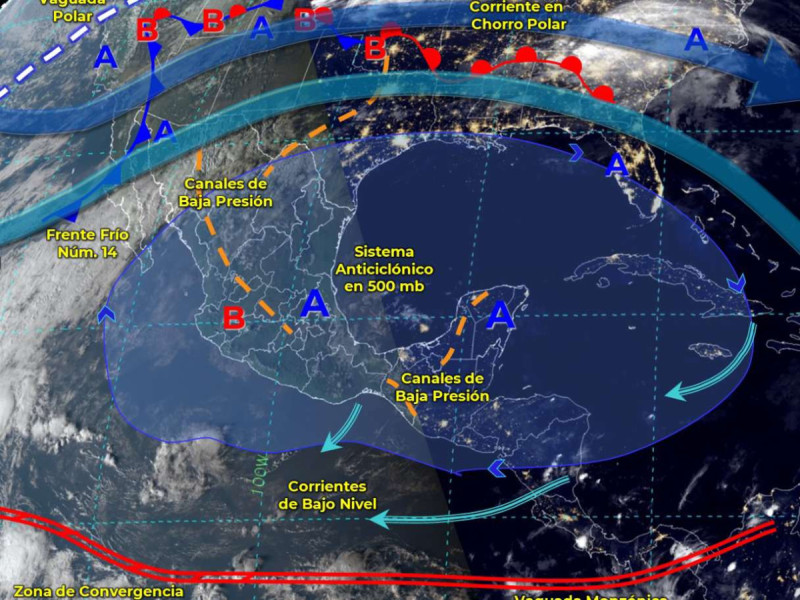 Finalmente, una circulación anticiclónica en niveles medios de la atmósfera, ocasionará baja probabilidad de lluvia en la mayor parte del territorio nacional, así como ambiente matutino y nocturno frío a muy frío sobre entidades de la Mesa del Norte y la Mesa Central, con heladas en sus zonas montañosas.