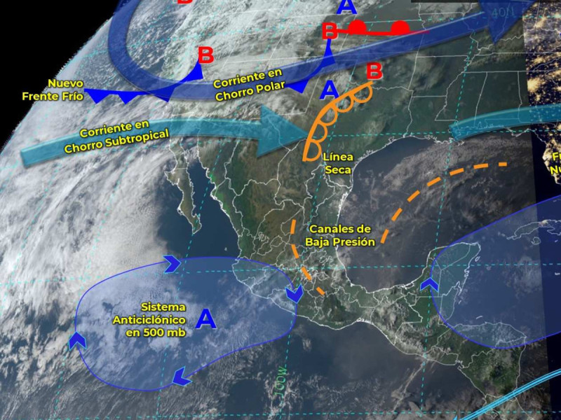 El nuevo frente frío se extenderá sobre el noroeste del país, en interacción con las corrientes en chorro polar y subtropical, ocasionará rachas fuertes de viento de 60 km/h en Baja California, además de oleaje elevado de 1 a 3 metros de altura en su costa occidental. Por otra parte, una línea seca sobre Coahuila, propiciará rachas fuertes de viento de 60 km/h con posibles tolvaneras en el noreste del territorio nacional.