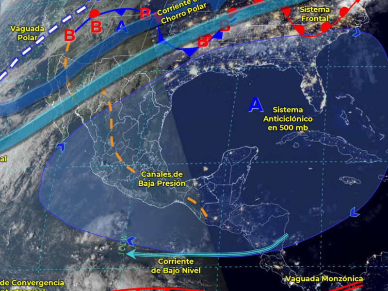 Finalmente, una circulación anticiclónica en niveles medios de la atmósfera, propiciará baja probabilidad de lluvia en la mayor parte del territorio nacional, así como ambiente matutino y nocturno frío a muy frío sobre entidades de la Mesa del Norte y la Mesa Central, con heladas en sus zonas montañosas.