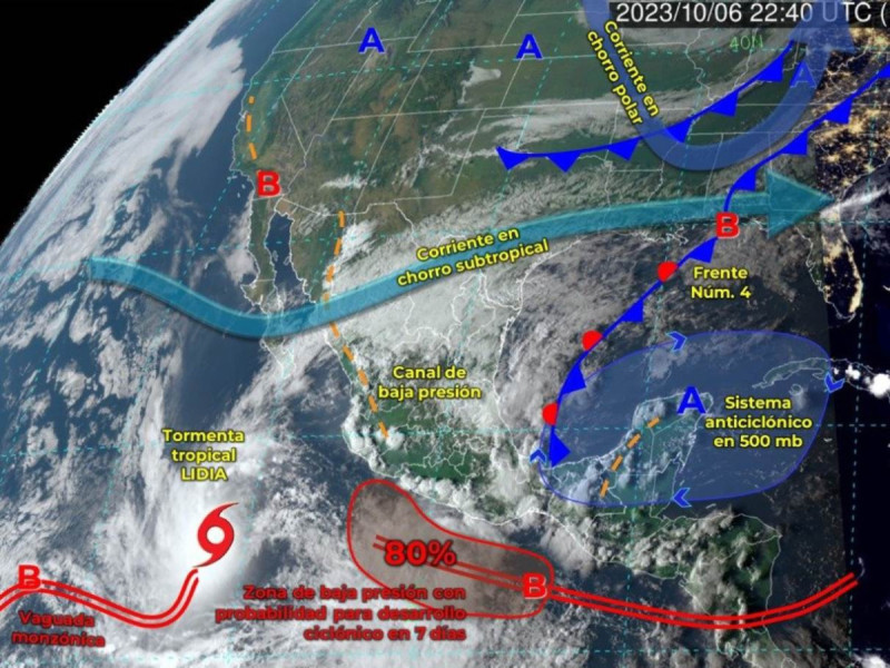 El Servicio Meteorológico Nacional (SMN) dio a conocer el pronóstico del clima México hoy 7 de octubre de 2023, en el que se prevé lluvias por el frente frío 4 y el avance del ciclón tropical “Lidia” a costas de Baja California Sur, tal vez como huracán categoría 1.