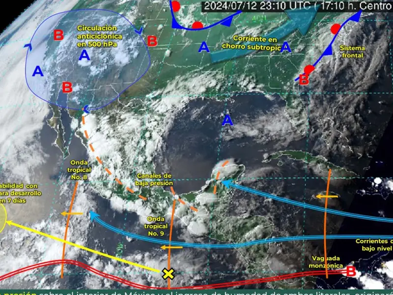 El clima para este sábado 13 de julio de 2024 prevé que canales de baja presión y el ingreso de humedad de ambos litorales, producirán lluvias puntuales intensas en Sonora, Chihuahua, Sinaloa, Durango, Nayarit, Jalisco y Puebla.