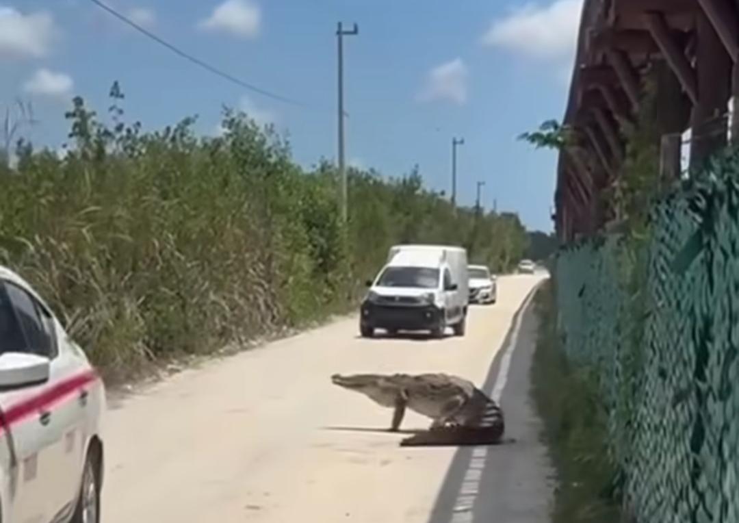 En el video, grabado por el ciudadano Javier Peniche Gamboa, se observa al enorme reptil cruzando lentamente de un lado a otro del camino, lo que obligó a los automovilistas a frenar de inmediato para evitar cualquier riesgo.