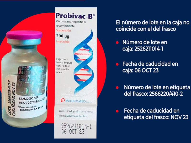 La autoridad sanitaria alerta a profesionales de la salud y a la población en general sobre la falsificación de este biológico de Probiomed, titular del registro sanitario. El producto falsificado presenta número de lote 2526211014-1 en el empaque secundario o externo, y 2566220/410-2 en la etiqueta del frasco ámpula, además, la fecha de caducidad en el empaque secundario es del 6 de octubre de 2023 y en la etiqueta es noviembre de 2023.