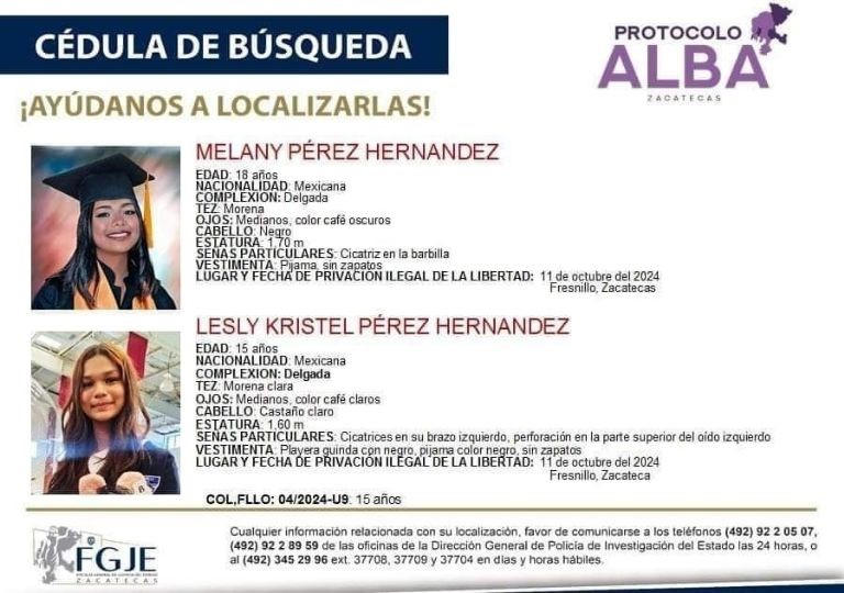 Las personas que tengan datos que ayuden a localizar a las hermanas pueden comunicarse a  los teléfonos (492) 92 2 05 07, o (492) 92 2 89 59 de las oficinas de la Dirección General de Policía de Investigación del Estado; ambas líneas están disponibles las 24 horas del día.
