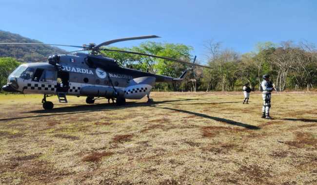 Efectivos de la Guardia Nacional cuentan con apoyo de un helicóptero MI-17 para el traslado de brigadistas a los puntos donde combaten el fuego en forma directa, además de la descarga de agua desde las alturas con el fin de frenar su avance.